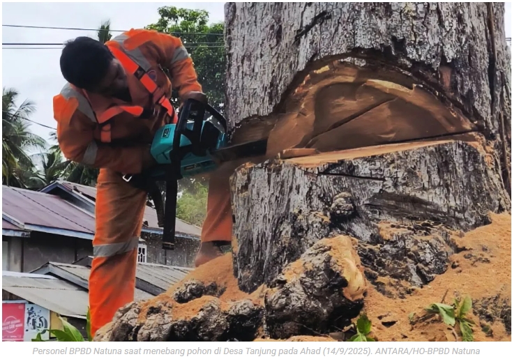 Natuna (ANTARA) - Badan Penanggulangan Bencana Daerah (BPBD) Kabupaten Natuna, Provinsi Kepulauan Riau, menebang sebuah pohon 'pauh tua' berusia sekitar...