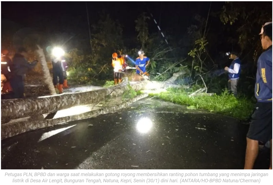 Natuna (ANTARA) – Layanan listrik tiga kecamatan di Natuna, Provinsi Kepulauan Riau terputus karena tiang dan kabel jaringan ditimpa pohon tumbang akibat angin kencang yang terjadi pada Senin dini hari.