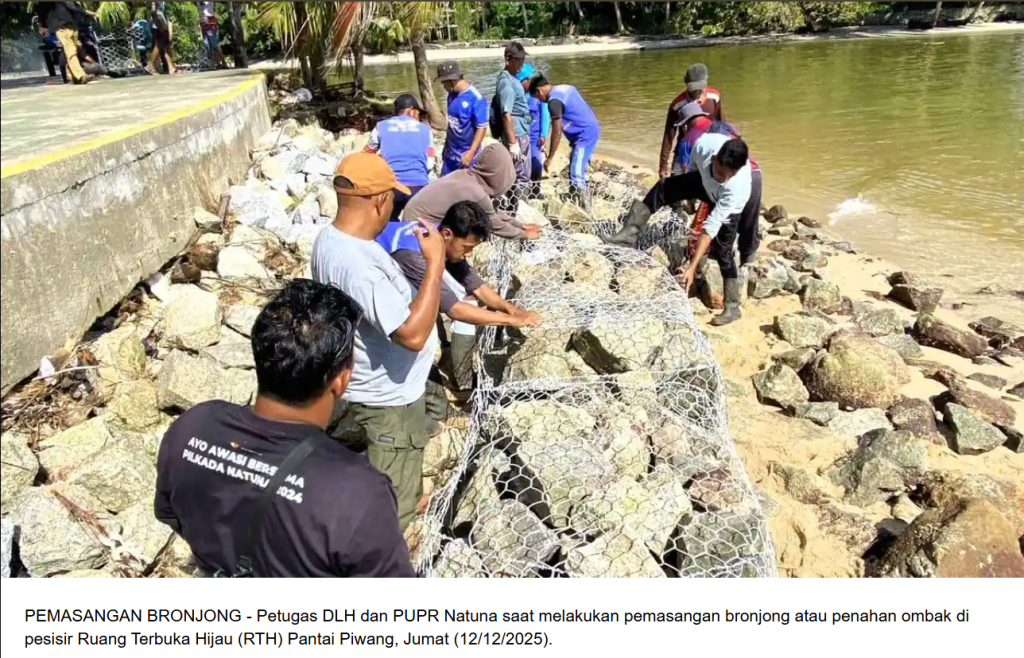 Salah satu upaya yang dilakukan dengan memasang 20 bronjong atau penahan ombak di kawasan Ruang Terbuka Hijau (RTH) Pantai Piwang, Ranai, Jumat (12/12/2025).