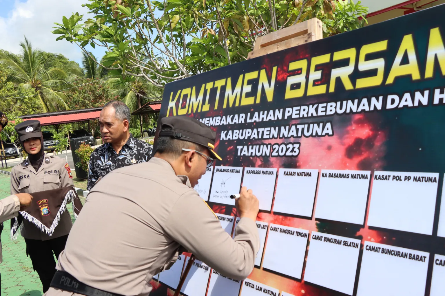 Kapolres Natuna AKBP Nanang Budi Santosa, S.I.K menandatangani Deklarasi Pencegahan Karhutla, Kamis (4/5/2023). (Foto: humas).