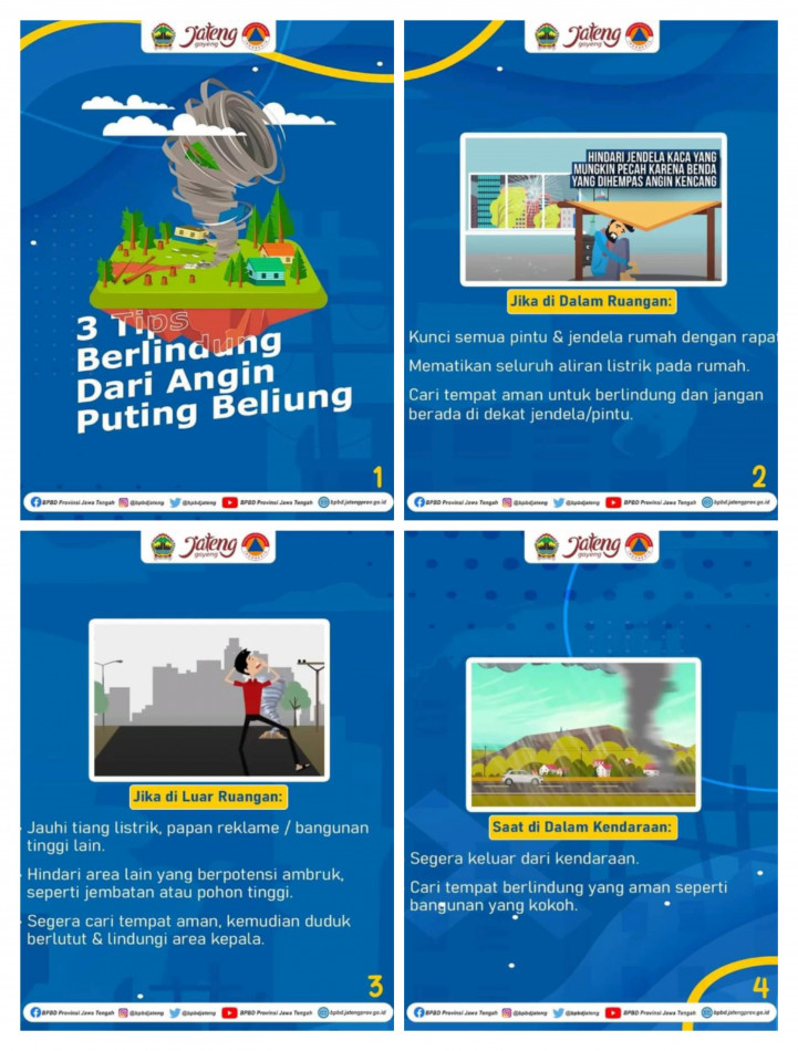 Berikut ini tips yang diberikan Badan Penanggulangan Bencana Daerah (BPBD) Provinsi Jawa Tengah saat terjadi angin puting beliung.